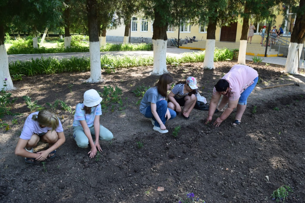 Затем школьники высадили на клумбах шаровидную хризантему, бархатцы и вербену, которые будут цвести всё лето и радовать своим цветением даже после летних каникул.