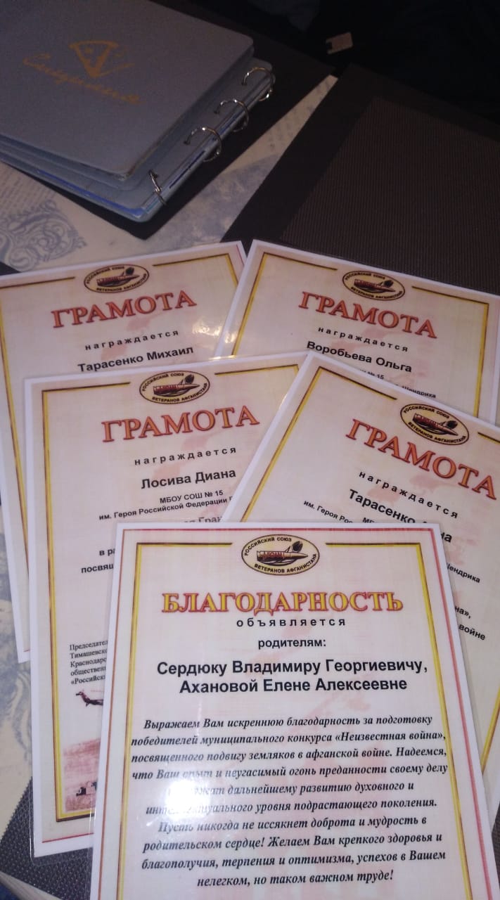 Учащиеся 3 г класса Воробьева Ольга Игоревна, Лосива Диана Семеновна, Тарасенко Михаил Викторович, Тарасенко Анна Викторовна, классный руководитель Кулиш Юлия Васильевна приняли участие в муниципальном этапе конкурса «Неизвестная война», посвященном подвигу земляков в афганской войне, который проводился с 19 ноября 2018 по 22 января 2019 года, где результатом участия стало «Гран-при».
